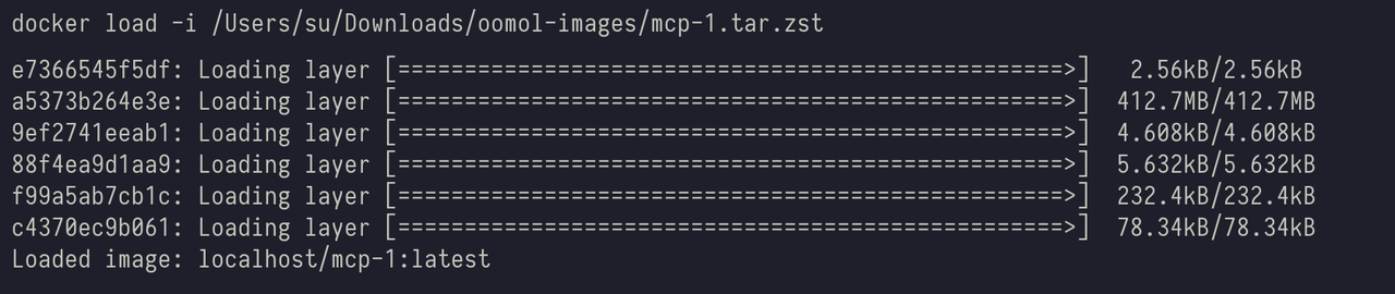 When the import is complete, you will see the name of the imported image in the last line, like in the image above: Loaded image: localhost/mcp-1:latest. Here, localhost/mcp-1:latest is the name of the imported image.