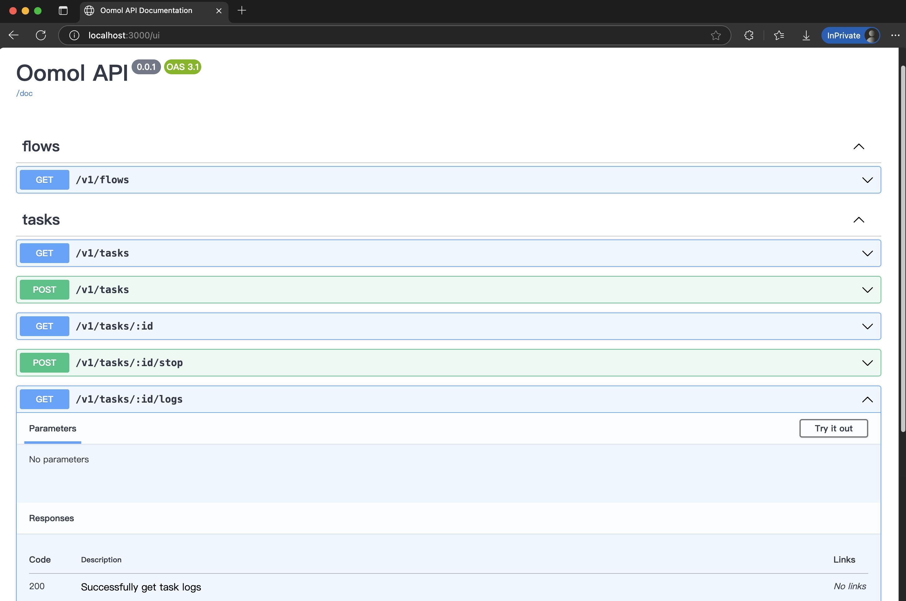 You can check the status of the task execution by requesting localhost:3000/v1/tasks/{taskId}/logs.