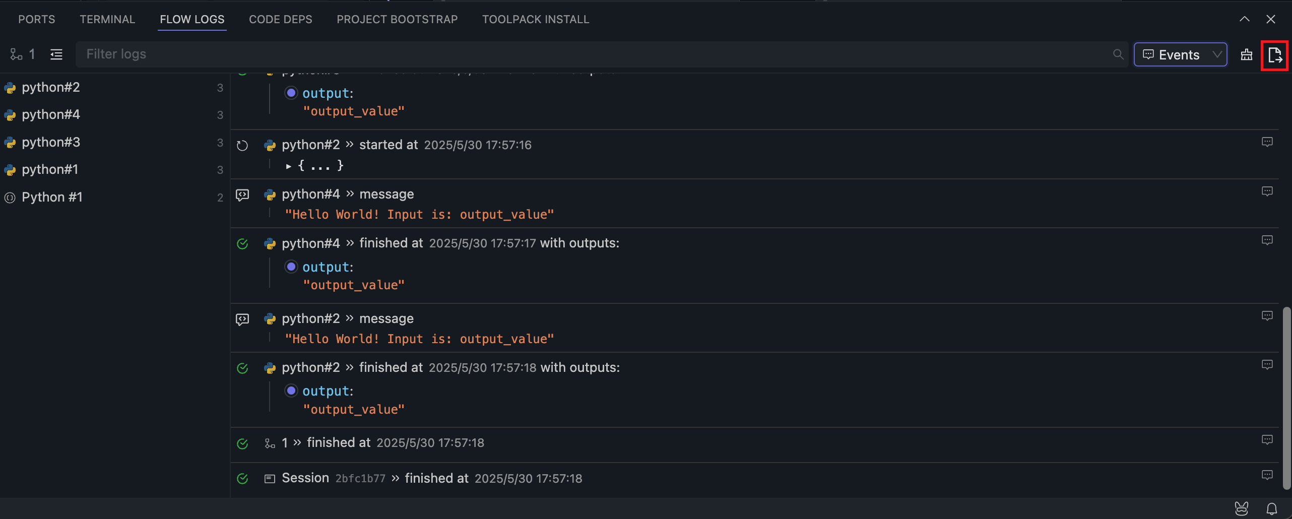 After running the Flow using any method, the log panel at the bottom will display the run logs. Each run will record the latest logs, overwriting the previous logs.