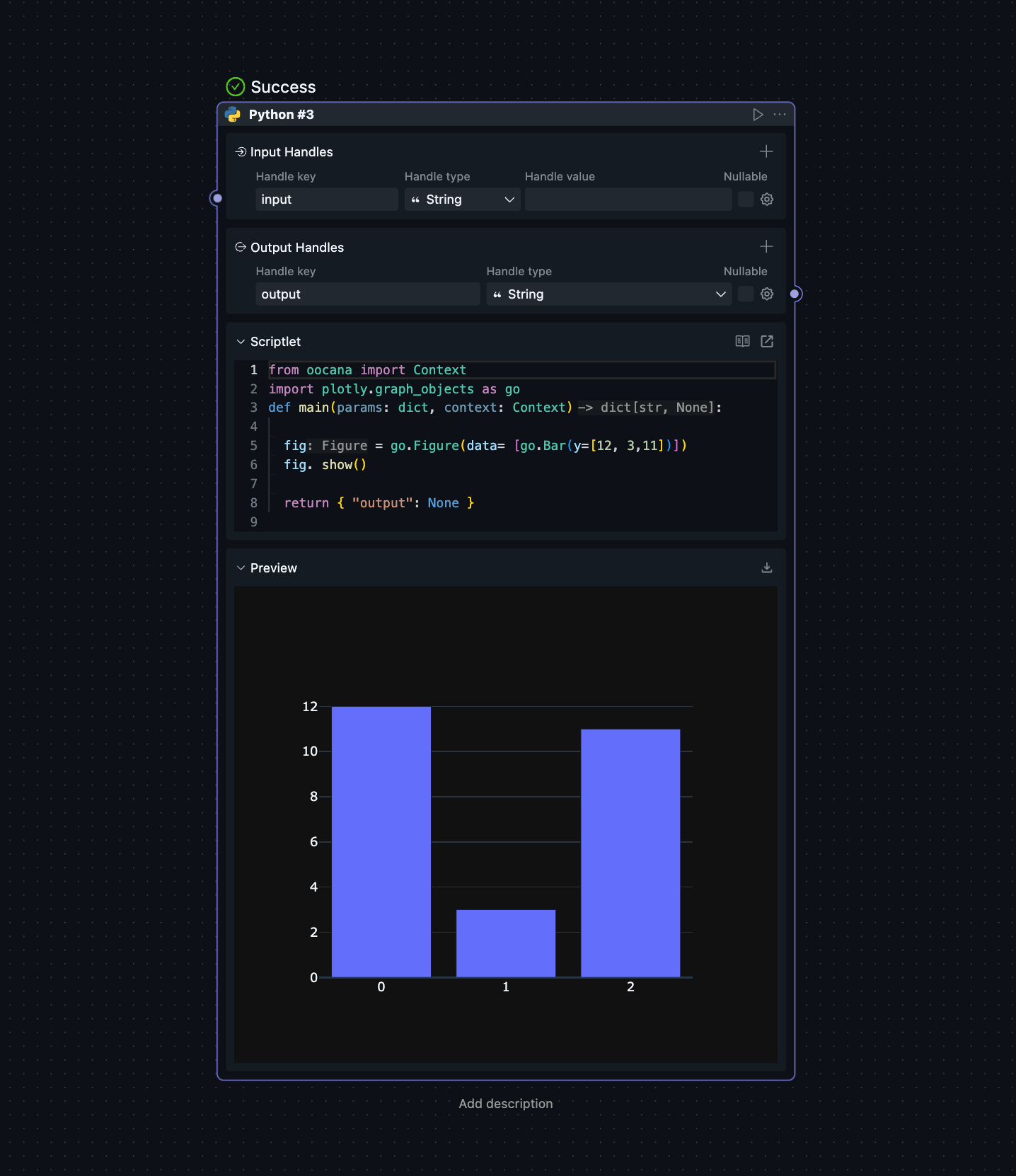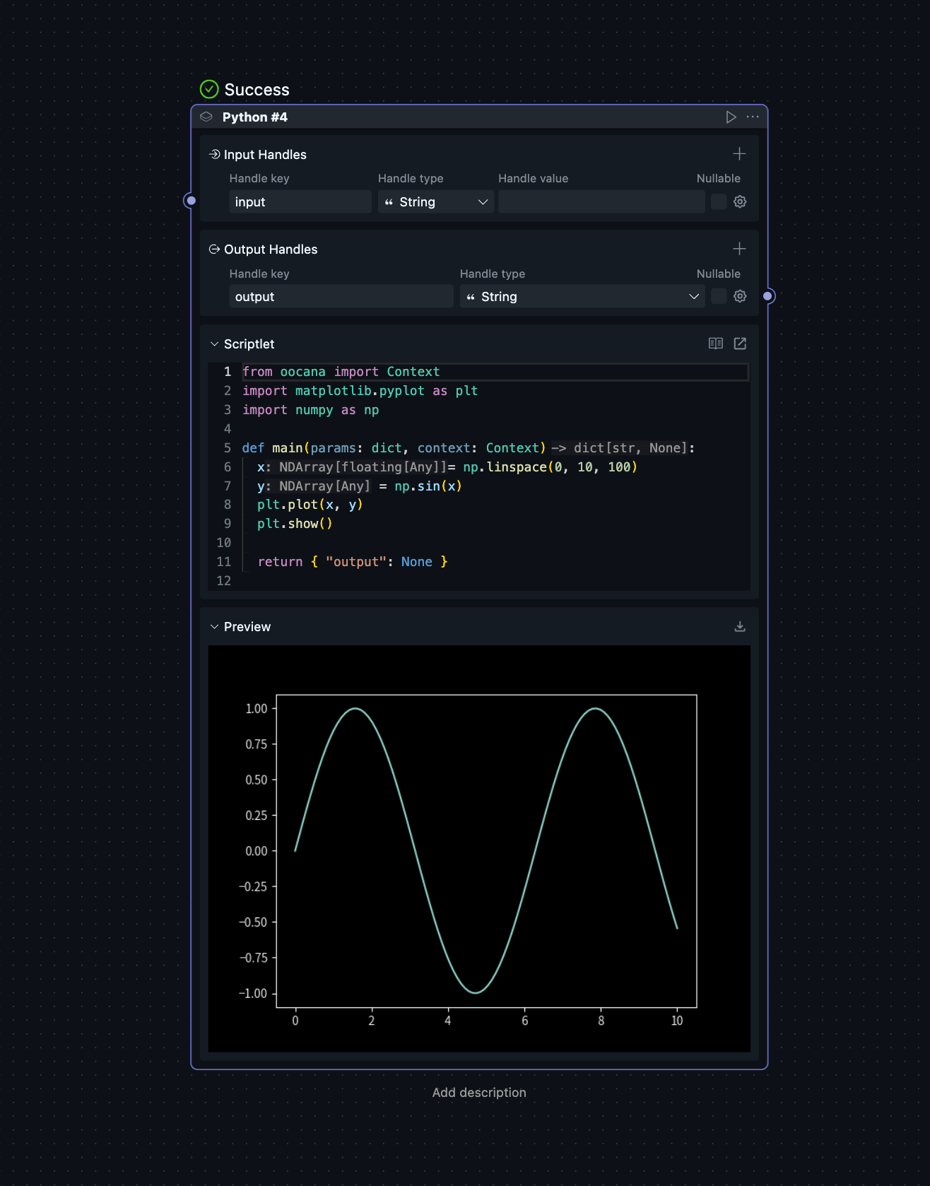 Below is the template function for a Scriptlet. You need to write your execution code within the function body. The input and output types can be customized, and third-party libraries are supported. To pass data to subsequent blocks, simply return a dictionary as you would in a normal function. OOCANA will use the top-level keys as the corresponding output handles, and the values as the output for those handles.
